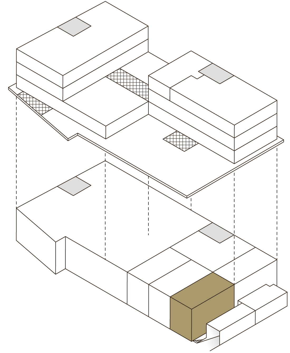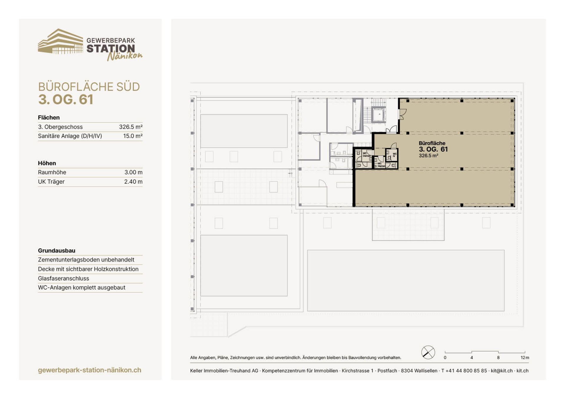 Der längsgezogene Holzbau. errichtet mit Holz aus heimischen Wäldern, erstreckt sich über vier Geschosse und die Zugänge in die Flächen erfolgen über zwei Treppenhäuser (Nord und Süd bzw. Heuwinkelweg 2 und 4). Die KMU Boxen verfügen über direkte, befahrbare Zugänge. Im 1. und 2. Obergeschoss stehen den Mietern Aussenbereiche in Form einer Terrasse zur Verfügung.