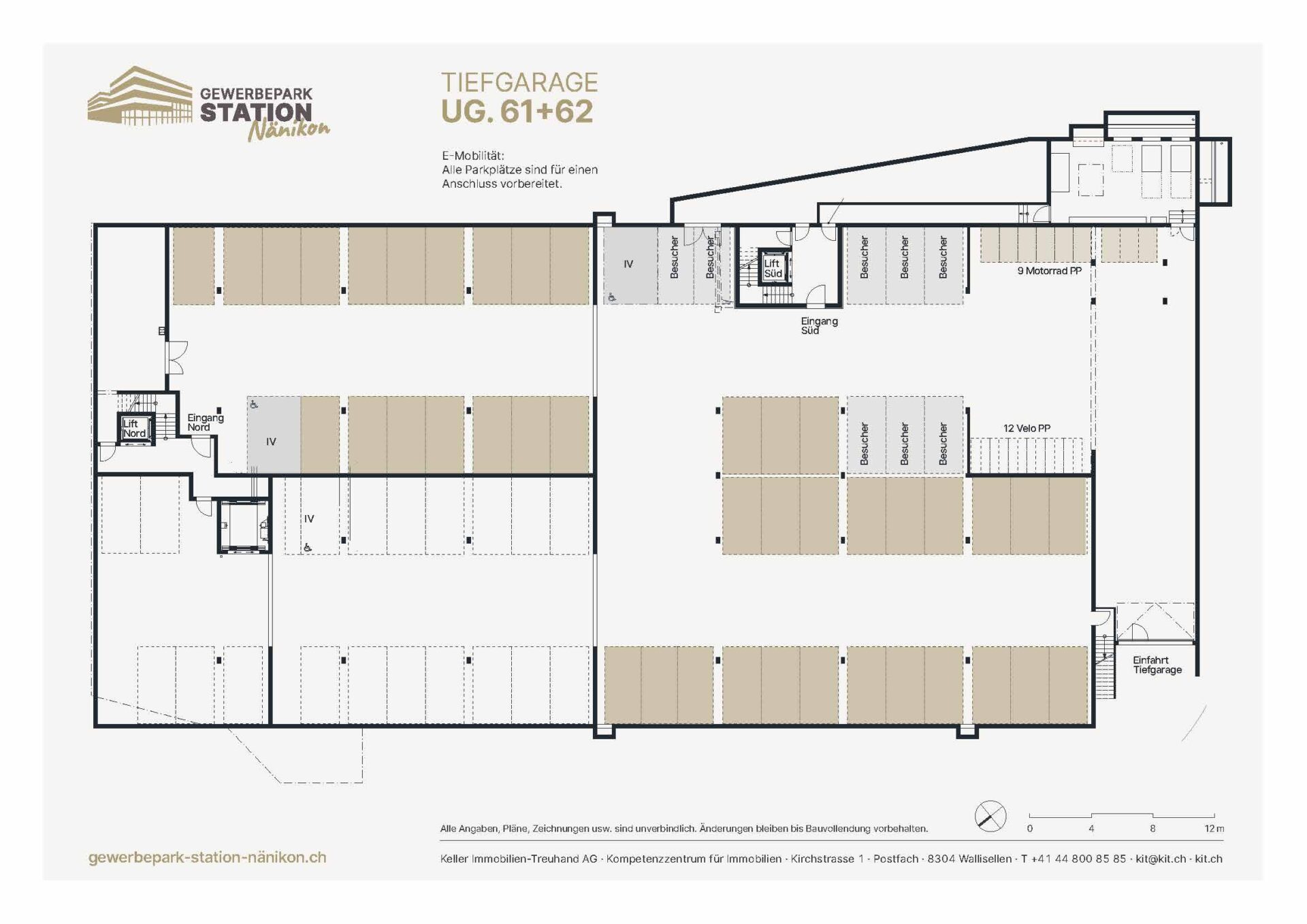 In der Tiefgarage sind eine grosse Anzahl Einstellplätze (für E-Mobilität vorbereitet) sowie zusätzlich Besucherparkplätze und Abstellplätze für Velos und Motorräder vorhanden.